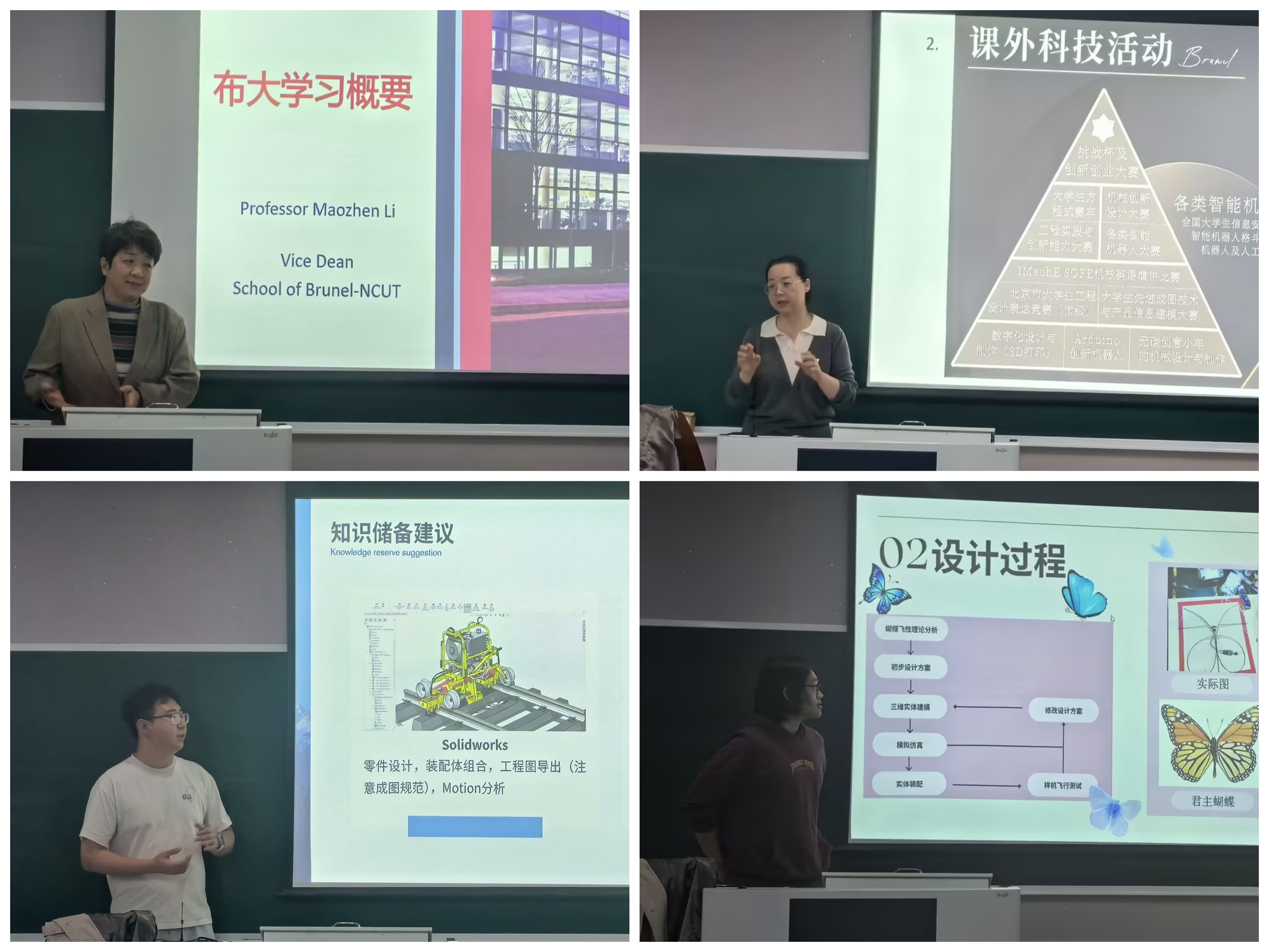 刘瑛老师着重介绍了机械专业课内培养体系与课外科技活动两个方面,强调了绩点的重要性与课外科技活动的作用。机械专业(中外合办)学生代表房子博、曹嘉睿分享了学习、竞赛和保研的相关经验。张若青为大家介绍了伦敦布鲁内尔大学的教务管理说明,特别强调了布大有关学籍、学位的相关管理规定。